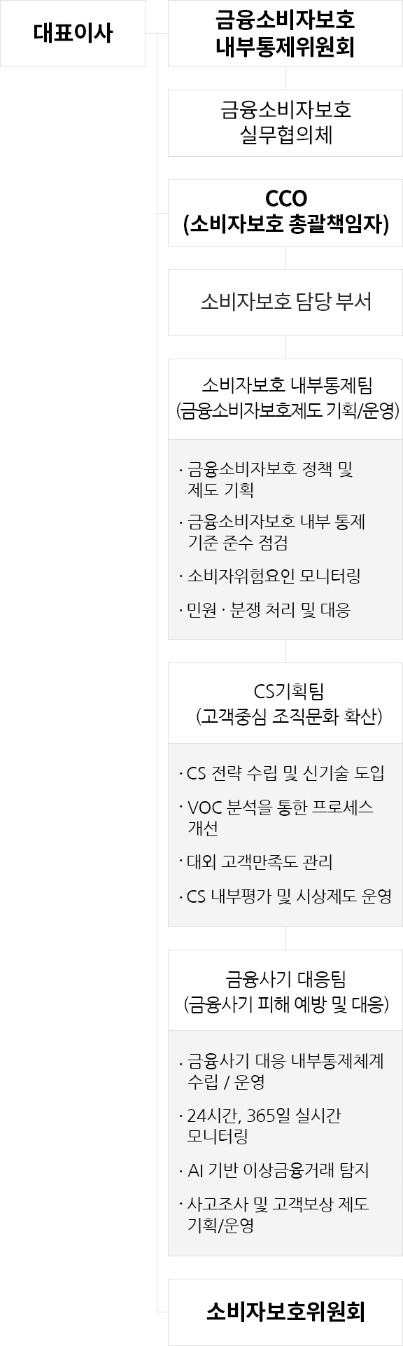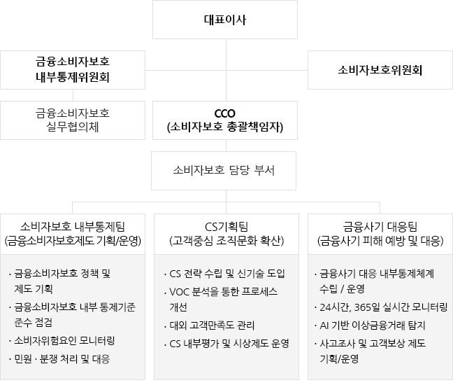 대표이사를 중심으로 금융소비자보호협의회, 소비자보호위원회가 있으며 금융소비자보호협의회은 금융소비자보호 실무협의채 담당하고 있습니다. 그리고 CCO(소비자 보호 총괄책임자)가 있으며 소비자보호팀 중심으로 고객 중심의 상품/서비스 점검 및 제도 개선, 금융소비자보호 제도 기획, 금융소비자보호 제도 운영이 있습니다. 고객 중심의 상품/서비스 점검 및 제도 개선은 CS 개선 과제 발굴, VOC 분석 및 예방책, 대외 CSI 평가 및 관리, CS 교육 등 CS 프로그램 기획 및 운영을 담당하고 금융소비자보호 제도 기획은 소비자보호 관련 기준수립, 소비자보호 제도 개선, 소비자보호 관련 임직원 교육, 민원 예방 및 재발 방지 대책 수립 담당하고 금융소비자보호 제도 운영은 소비자보호 관점의 사전심의, 민원처리 프로세스 운영, 불완전 판매 점검 및 예방 활동, 철회,항변 접수 및 처리 등을 담당합니다.