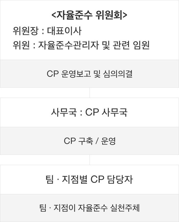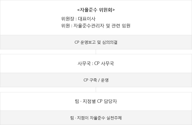 자율준수 위원회는 위원장 대표이사 위원 자율준수관리자 및 관련 임원을 중심으로 CP운영보고 및 심의의결을 담당하고 있습니다. 사무국은 CP사무국을 중심으로 CP 구축/운영을 담당하고 있습니다. 팀, 지점별 CP 담당자는 팀, 지점이자율준수 실천주체를 담당하고 있습니다.